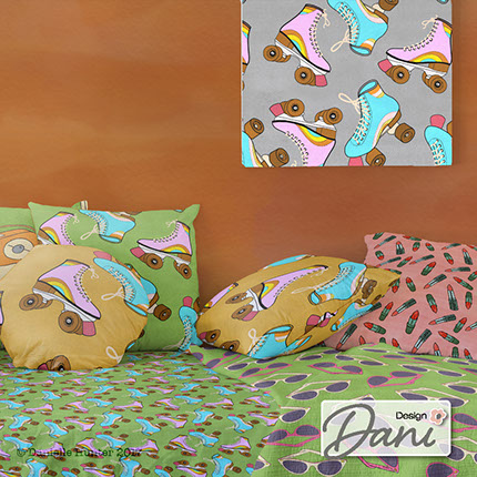A vibrant and super fun collection full of texture and colour with a retro vibe. I believe this collection is an all rounder and would work well on gift wrap, stationery, and bedding, fashion and fun sleepware.